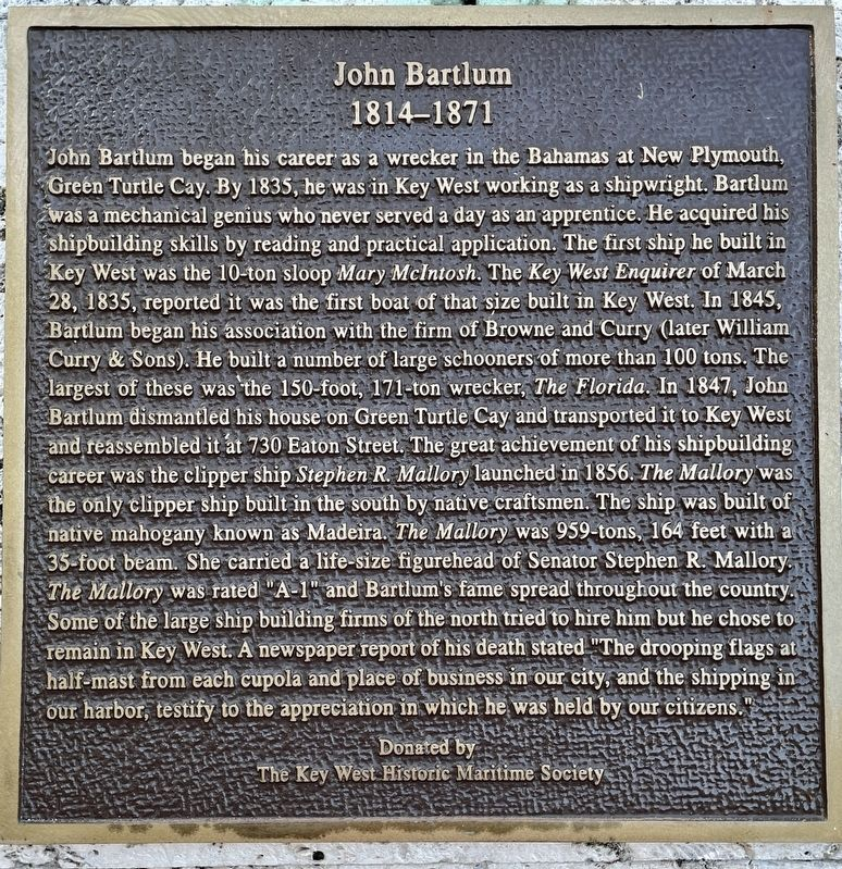 Captain Bartlum was a ship builder and built the only clipper ship, the Stephen R. Mallory, ever built in the state of Florida. He purchased the northeast corner of Lot 2, Square 35 (Eaton Street) from his brother Joseph Bartlum in 1847. He dismantled his home at Green Turtle Cay, Abaco, and reconstructed it on this Key West property in 1847–1848.
