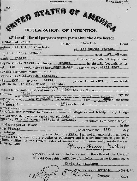 Winer Bethell and his family emigrated to Miami, Florida in 1918. Winer worked as a farmer and gardener and later operated a grocery store.