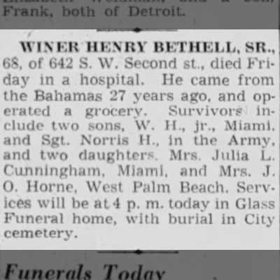 Winer Henry Bethell died August 1945 in Miami, Florida at 69 years of age. He was buried in the Miami City Cemetery with his wife.