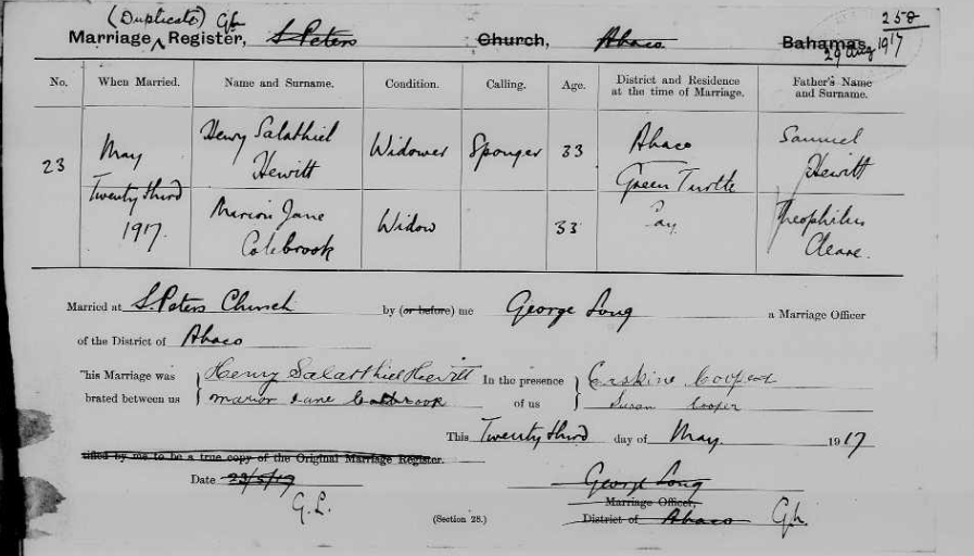 Marion Jane ‘Dana’ Hewitt née Cleare passed away in 1972 in Green Turtle Cay, Abaco.