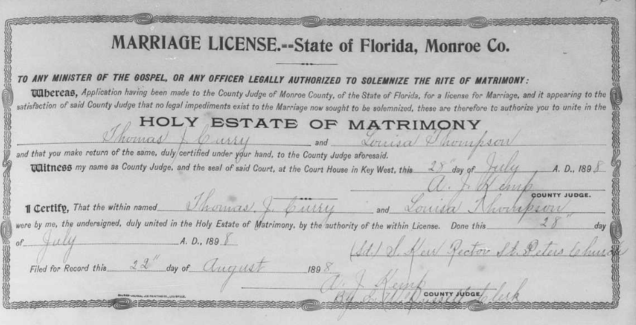 On July 28, 1898, in Key West, Florida, Thomas married Muriel Louise Thompson (1880-1960) from Key West, Florida. She is the daughter of Hope Town native Caleb Thompson (1845-1887?) and Affie Sarah Russell (1855-1933). They divorced in 1931 in Key West, Florida.