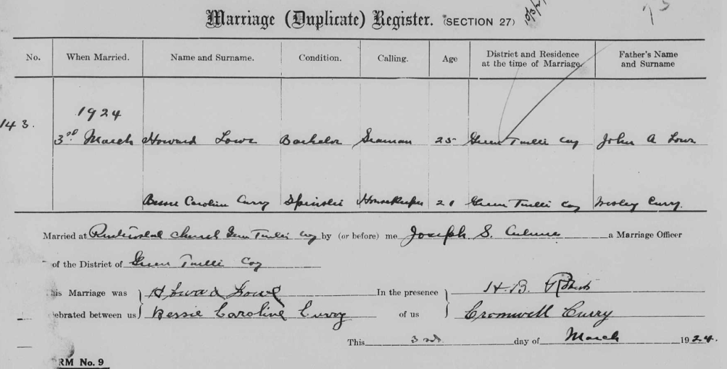 Howard married Bessie Caroline Curry (1903-1967) on March 3, 1924. Bessie is the daughter of Thomas WESLEY Curry (another loyalist descendant) and Lilla Carleton. Fifteen months later they became the proud parents of a baby boy John Wesley Lowe, my Dad.