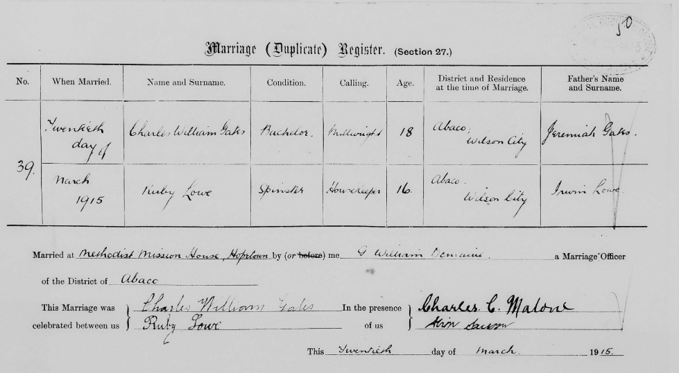 In March 1915, Charles married Alice Ruby Lowe (1898-1932) from Green Turtle Cay, Abaco. She is the daughter of William Irwin Lowe (1873-1951) and Alice Lowe (1873-1932).