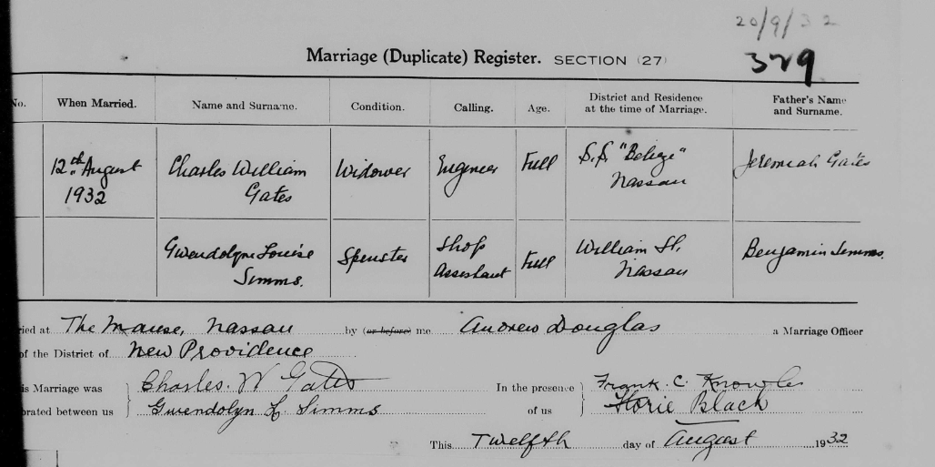 In August 1932, Charles married Gwendolyn Louise Simms (1905-1990) from Long Island. She is the daughter of Benjamin William A Simms (1865) and Isora Larbelle Pinder (1885-1964).