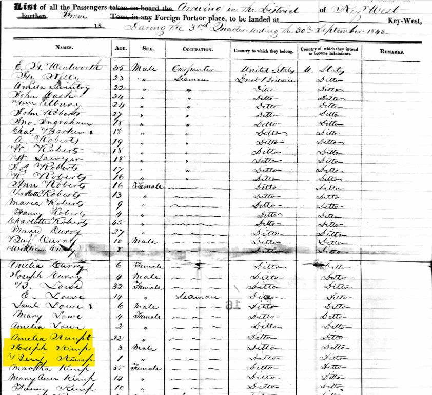 In December 1839 on Green Turtle Cay, Amelia married Brilander William Kemp (1813-1882). He is the son of Samuel Kemp. William and Amelia immigrated to Key West, Florida. The marriage was officiated by