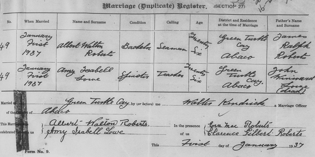 Amy Isabell Roberts née Lowe passed away on October 13, 1993 (age 83) in Green Turtle Cay, Abaco.