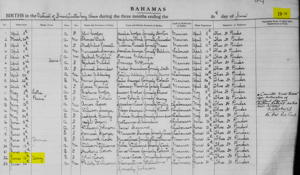 Amy Isabell Lowe was born on June 12, 1910, in Green Turtle Cay, Abaco to John Lenward Lowe (1874-1913) and Masie Isabel Sawyer (1890-1950).