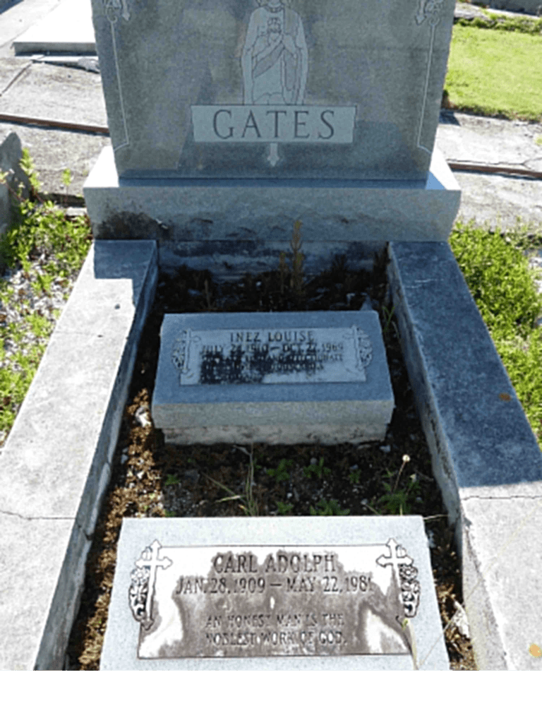 In February 1928, Inez married Carl Adolph Gates (1909-1981) from Hope Town, Abaco. He is the son of John William Gates Jr (1880-1962) and Rosa Olivia Malone (1882-1945).