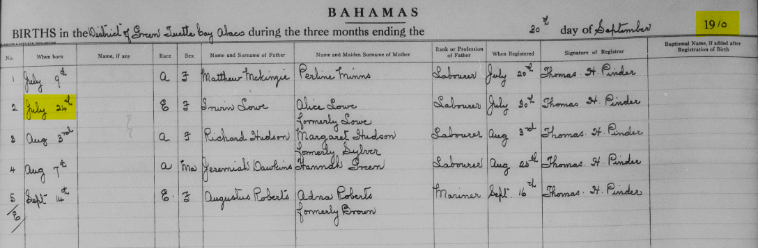 Inez Louise Lowe was born on July 24, 1910, in Green Turtle Cay, Abaco to William Irwin Lowe (1873-1951) and Alice Lowe (1873-1932).
