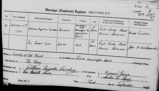 In September 1948, Iris married William Augustus ‘Billy’ Saunders (1929-2015) from Nassau, New Providence. He is the son of Arnold William Saunders and Iola Elizabeth Roberts.