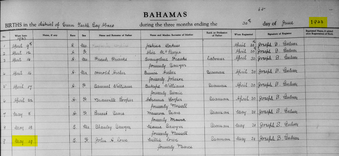 Iris Isabell Lowe was born on May 19, 1923, in Green Turtle Cay, Abaco to John Aquilla Lowe (1858-1925) and Mildred Elizabeth Pearce (1881?-1956).