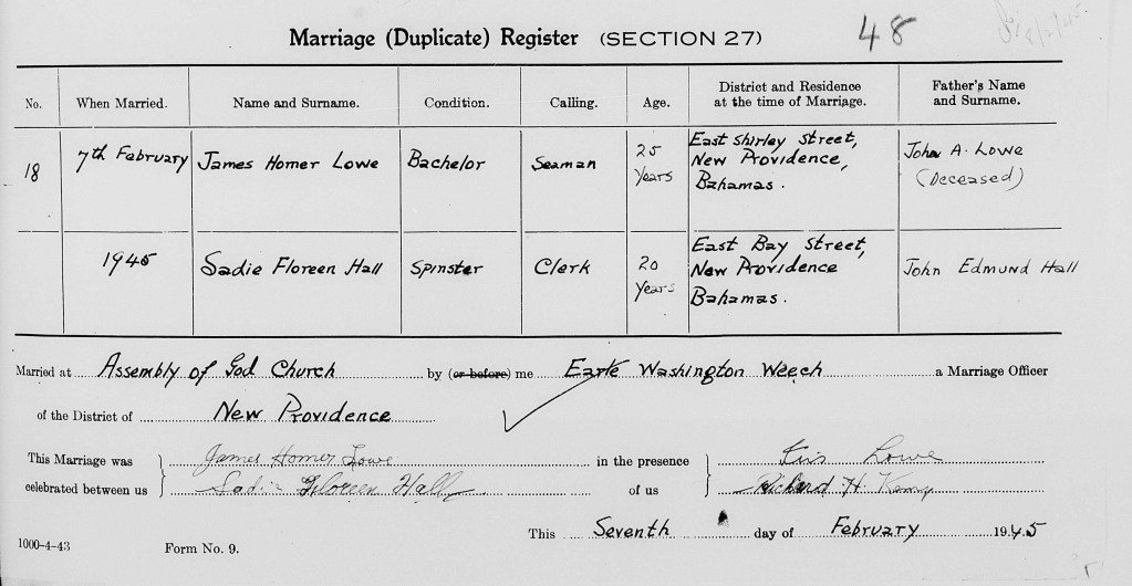 In February 1945, Homer married Sadie Florine Hall (1924-2021) from Current, Eleuthera. She is the daughter of John Edmund Hall (1899-1982) and Annie Evelyn Griffin (1902-1926).