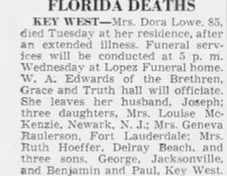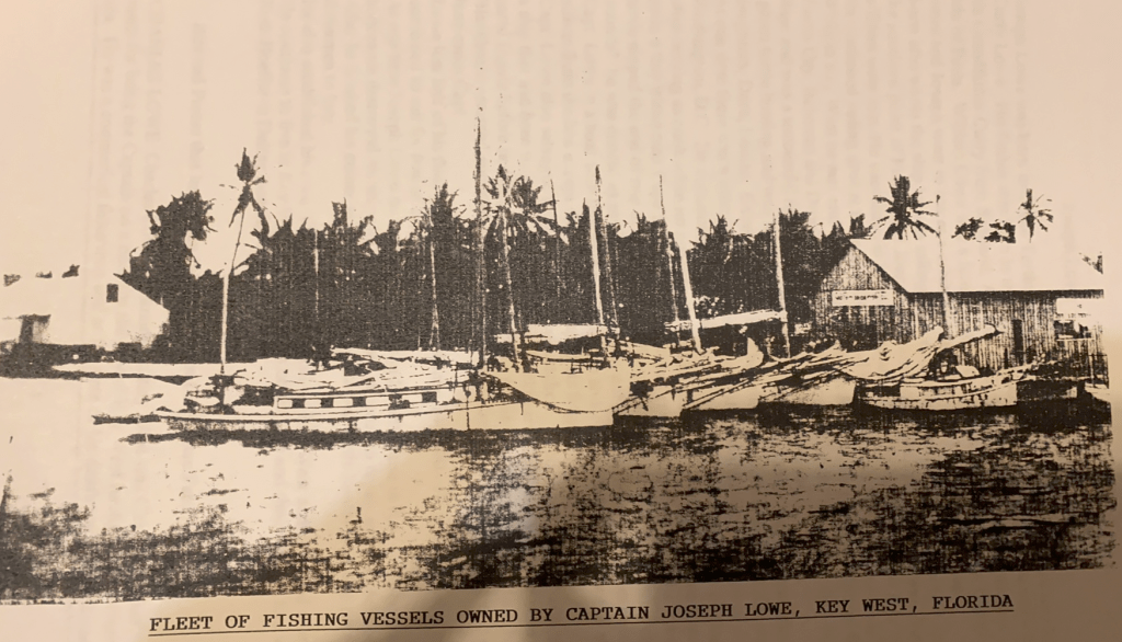 During one of South Florida’s worst hurricanes, he lost half his fleet, worth $40,000 at the time. He sold homes on Lowe’s Lane in Key West to fund repairs and new boats. After retiring, he made nets for other fishermen and established Gospel Hall in Key West, where he preached. He remained in Key West until his wife’s death, then went to live with his daughter Ruth Hoeffer in Delray Beach, Florida