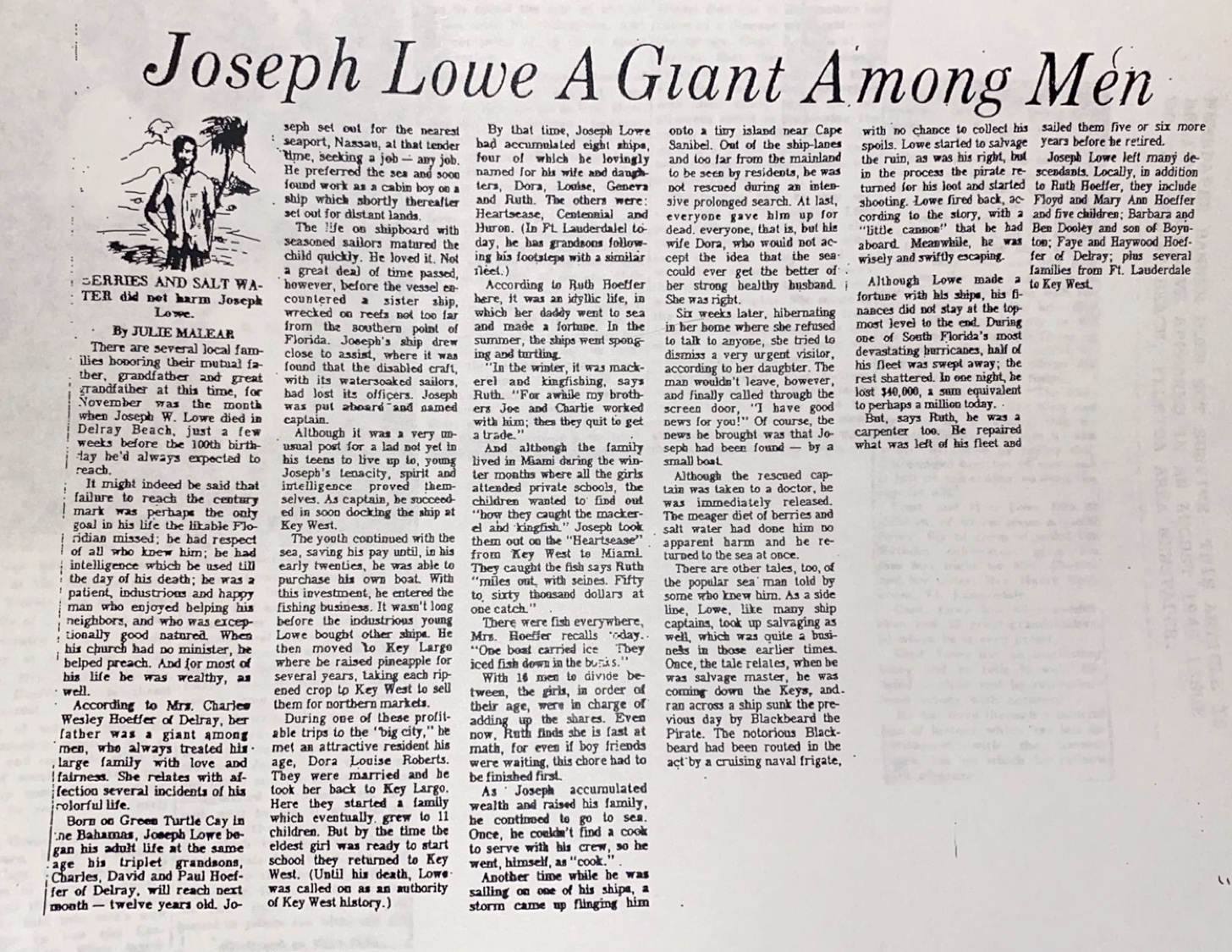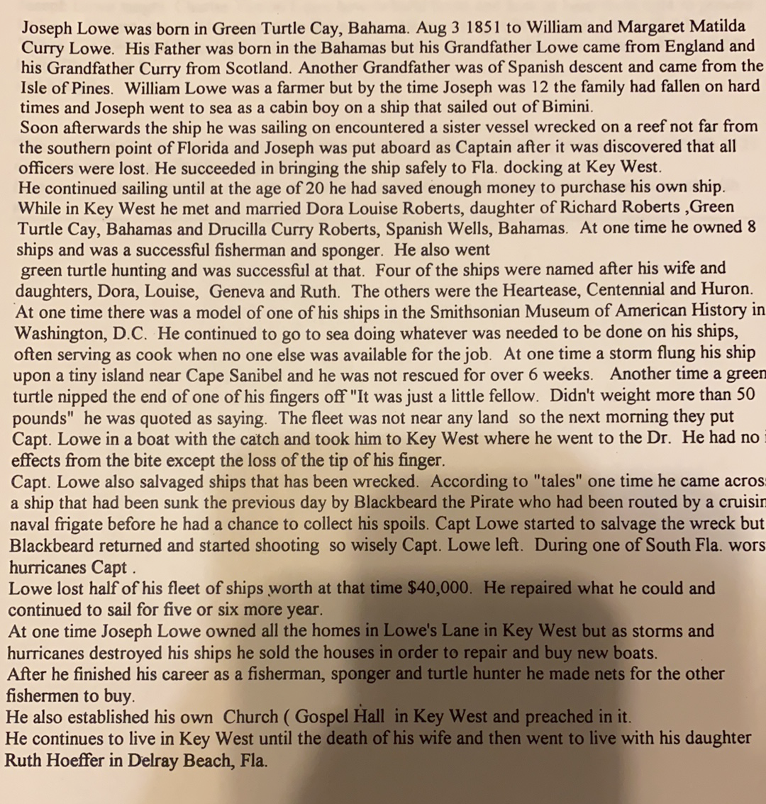 Dad William Lowe was a farmer, but by the time Joseph was 12, the family had fallen on hard times. Joseph went to sea as a cabin boy on a ship that sailed out of Bimini. Soon afterwards, the ship he was sailing on encountered a sister vessel wrecked on a reef near the southern tip of Florida. With all the officers lost, Joseph was put aboard as captain and succeeded in bringing the ship safely to Key West.
