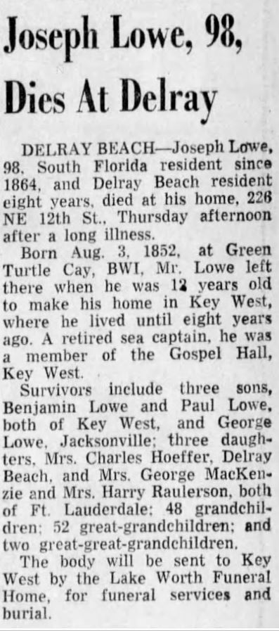 Captain Joseph W. Lowe was born on August 3, 1851, in Green Turtle Cay, Abaco to William Piorka Lowe and Margaret Matilda Curry.