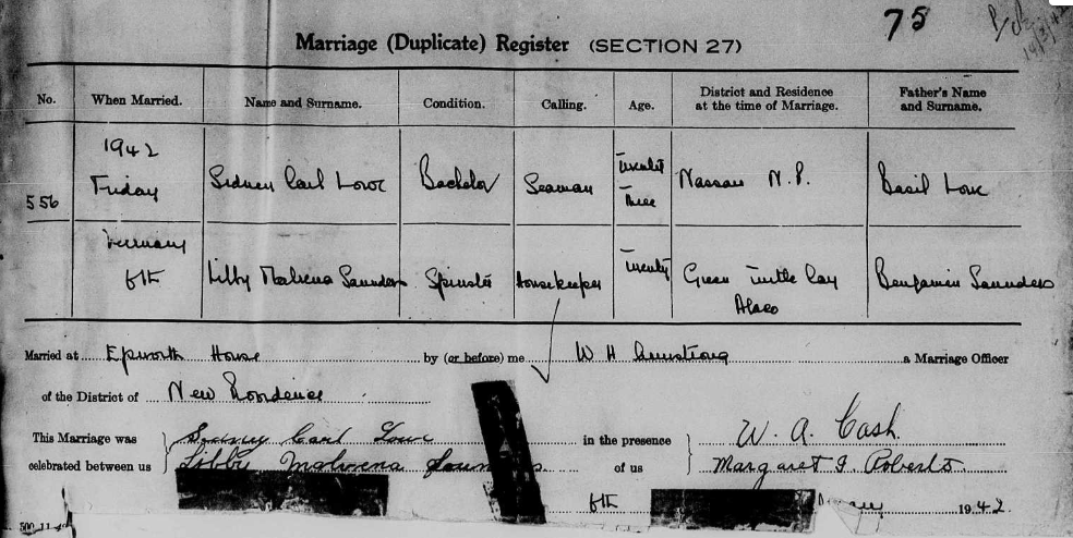Sidney Carl Lowe was born on February 28, 1919 in Green Turtle Cay, Abaco to Basil Ambrose Lowe (1896-1966) and Rosa Muriel Roberts (1898-19??).