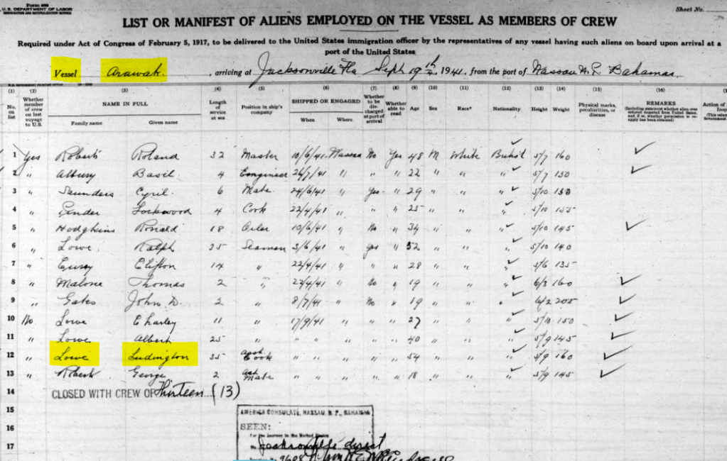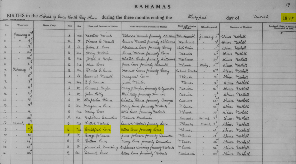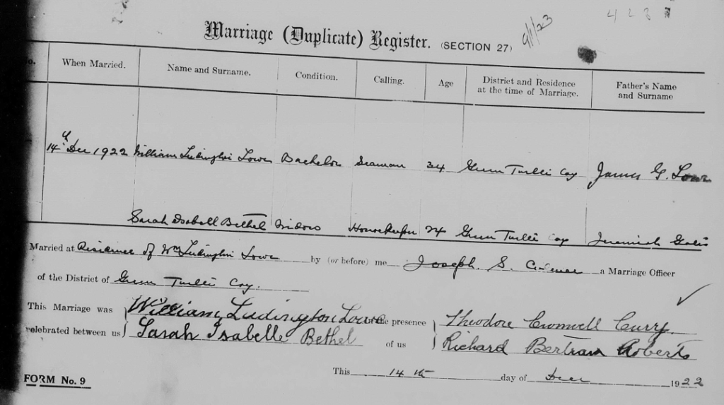 William Ludington ‘Lud’ Lowe was born on March 10, 1887, in Green Turtle Cay, Abaco to James A Guilford Lowe (1851-1924) and Ellen Lowe.
