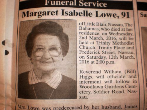 Margaret Isabelle Lowe née Roberts passed away on March 2, 2016 (age 91) in Nassau, New Providence.