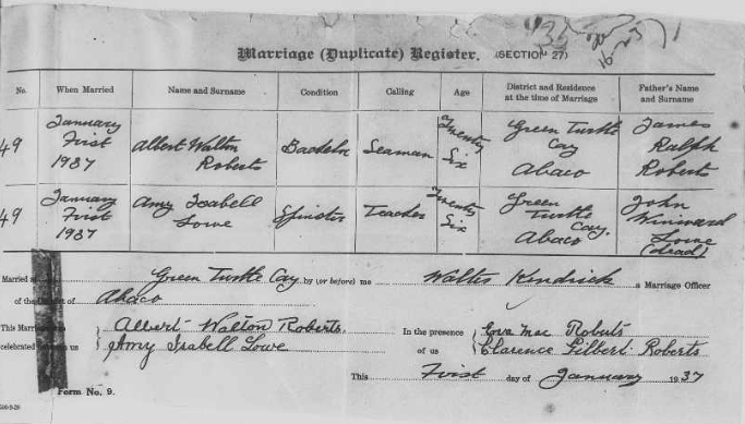 On August 23, 1903, Albert married Amy Isabell Lowe (1910-1993) from Green Turtle Cay, Abaco. She is the daughter of John Lenward Lowe (1874-1913) and Maysie Isabell Sawyer (1890-1950).