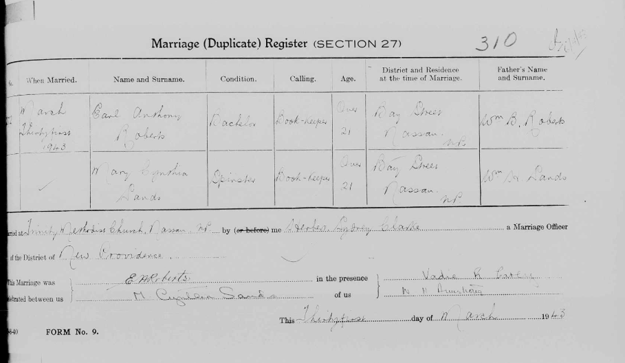 Earl Anthony ‘Tony’ Roberts was born on July 1, 1919, in Green Turtle Cay, Abaco to William Branwell Roberts (1876-1960) and Eudora Isabel Curry (1884-1959).