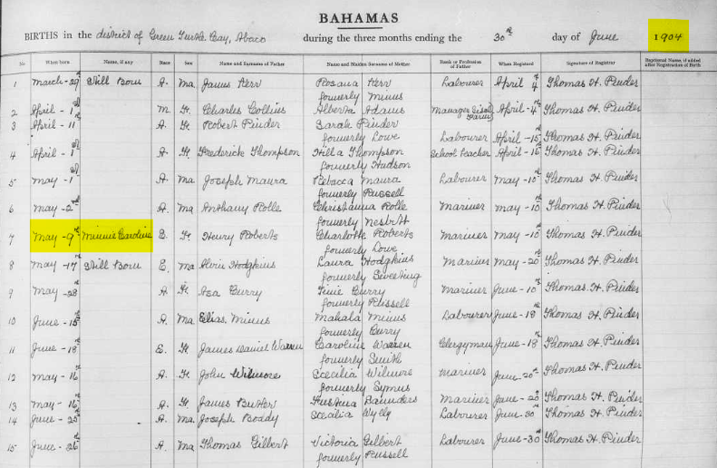 Minnie Caroline Roberts was born May 9, 1904, on Green Turtle Cay, Abaco to Henry Foster Roberts (1867-1938) and Charlotte Elizabeth Lowe (1874-1973).