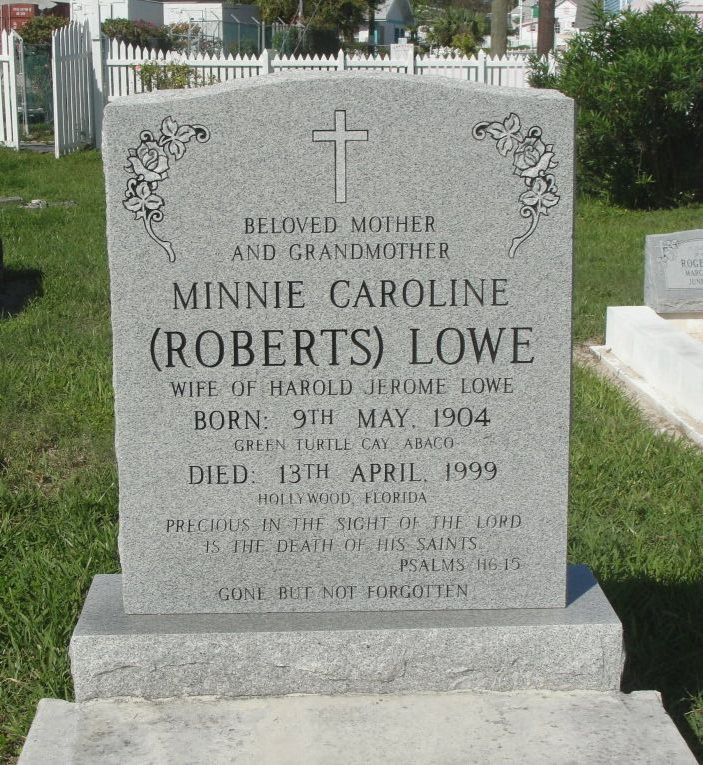 On March 26, 1922 in Green Turtle Cay, Abaco, Minnie married Harold Jerome Lowe (1904-1987) son of Edwin Jerome Lowe (1871-1932) and Alice Missouri Roberts (1878-1946).