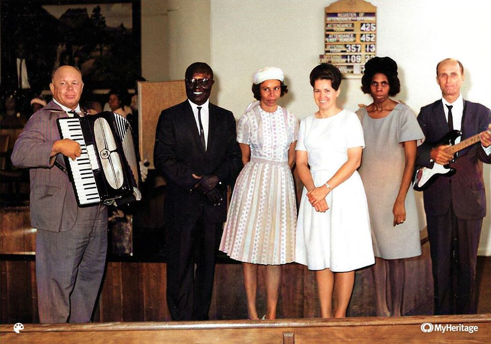 Winston Ronald Churchill Simms (1918-2000) on the accordion and Noel Augustus Roberts (1917-2009) on the guitar. Noel’s wife, Ivy Angela Gates Roberts (1934-2015) in the stunning white hat.