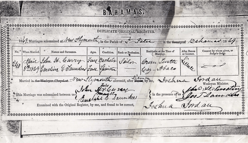 On April 8, 1869, in Green Turtle Cay, Abaco, Emaline married John Henry Curry (1849-1939) from Green Turtle Cay, Abaco. He is the son of John Curry (1827-1892) and Eliza Ann Albury (1830-1892)