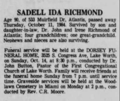 Sadell Ida ‘Sadie’ Saunders pass away on October 11, 1984 (age 97) in Lake Worth, Florida and is buried in Woodlawn Cemetery in Miami, Florida.