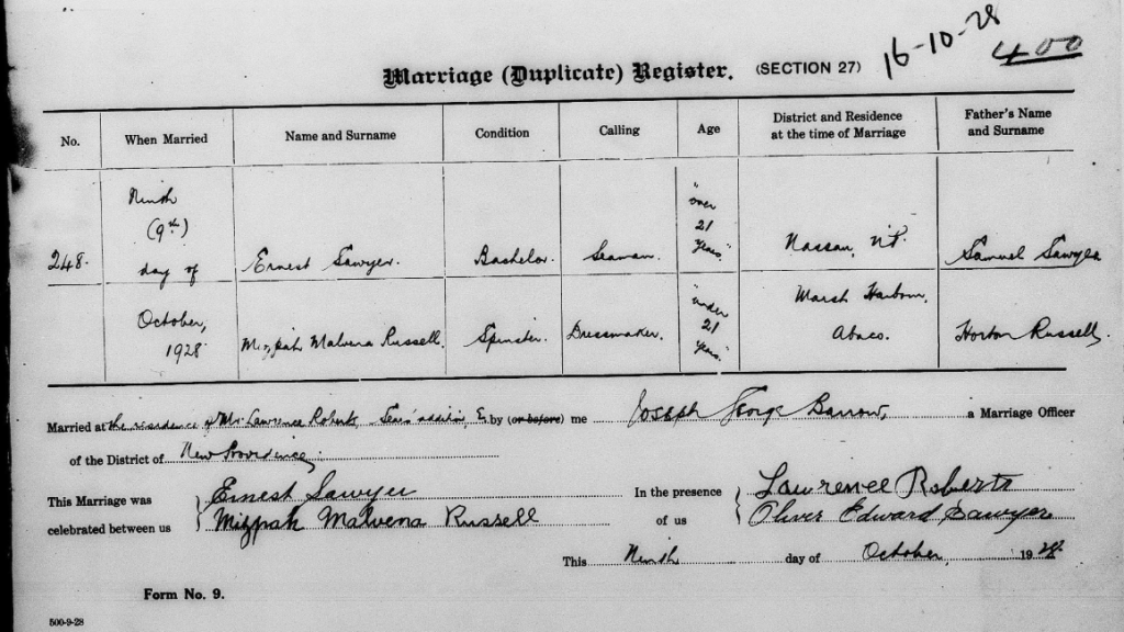 In October 1928, Ernest married Mizpah Malvena Russell (1912-1995) daughter of Richard Horton Russell (1889-1969) and Verona Angela Lowe (1893-1984) at Ebeneezer Methodist Church in Nassau, New Providence.