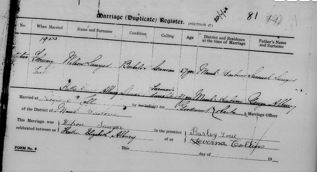 Thomas WILSON Sawyer was born on January 22, 1897, in Green Turtle Cay, Abaco to Samuel L Sawyer (1863?-1944) and Minerva Beatrice Lowe (1870-1913).