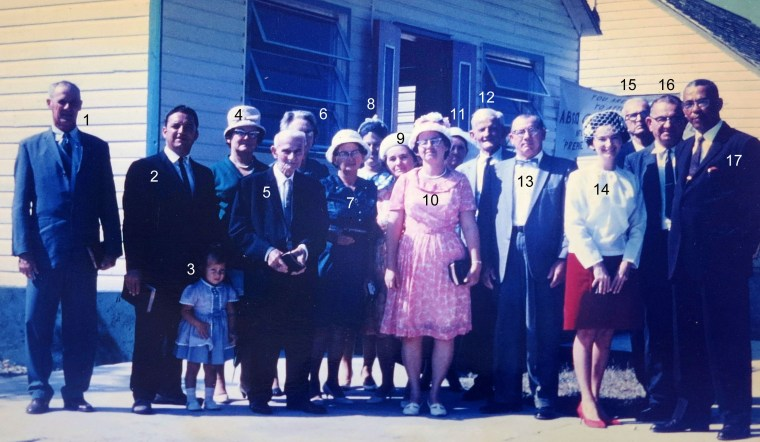 1-Roger Lowe (1914-2000), 2-Frank Perry, 3-Cecile Cartwright, 4-Inez Lowe Gates, 5-Dr. Walter Kendrick, 6-Nellie Louise Lowe Cash (1912-2005), 7-Minnie Caroline Roberts Lowe (1904-1999), 8-Mary Cartwright, 9-Mizpah Sawyer, 10-Merlee Alberta Lowe Key (1922 – 2004), 11-Nell Lowe, 12-Harry Roberts (1892-1976), 13-Gerald Leroy Key (1917-1994), 14-Iris Lowe Powers, 15-William Augustus Cash (1910-1992), 16-Harold Jerome Lowe (1904-1987), 17-Hartley Thompson